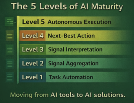 Level 5: Autonomous Execution AI executes actions within guardrails: automated onboarding steps, milestone progression, escalations, nudges, exception routing. This delivers operational scale but requires clean data, strong governance, and clear exception handling.
